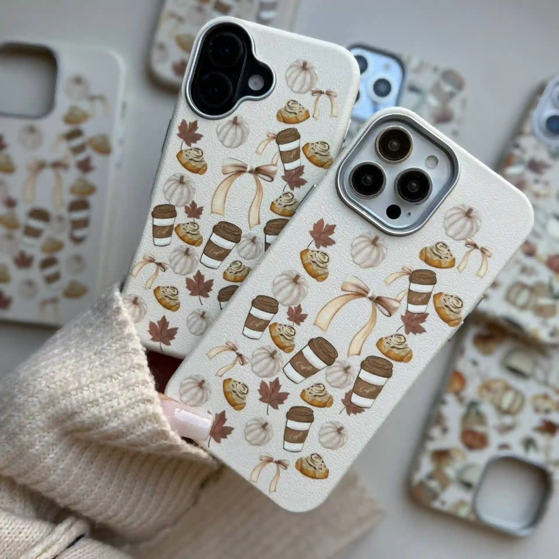 طراحی این قاب ترکیبی از لیوانهای قهوه، دارچین رول، کدو تنبل، برگهای پاییزی و پاپیونهای ظریف است که روی زمینهای کرمرنگ و گرم قرار گرفته و حس آرامش، گرما و مینیمالیسم پاییزی را بهخوبی منتقل میکند. اگر جزو افرادی هستید که جزئیات ظاهری گوشی برایتان اهمیت دارد و دوست دارید قاب گوشیتان بازتابی از سلیقه شخصیتان باشد، این مدل دقیقاً برای شما طراحی شده است.
